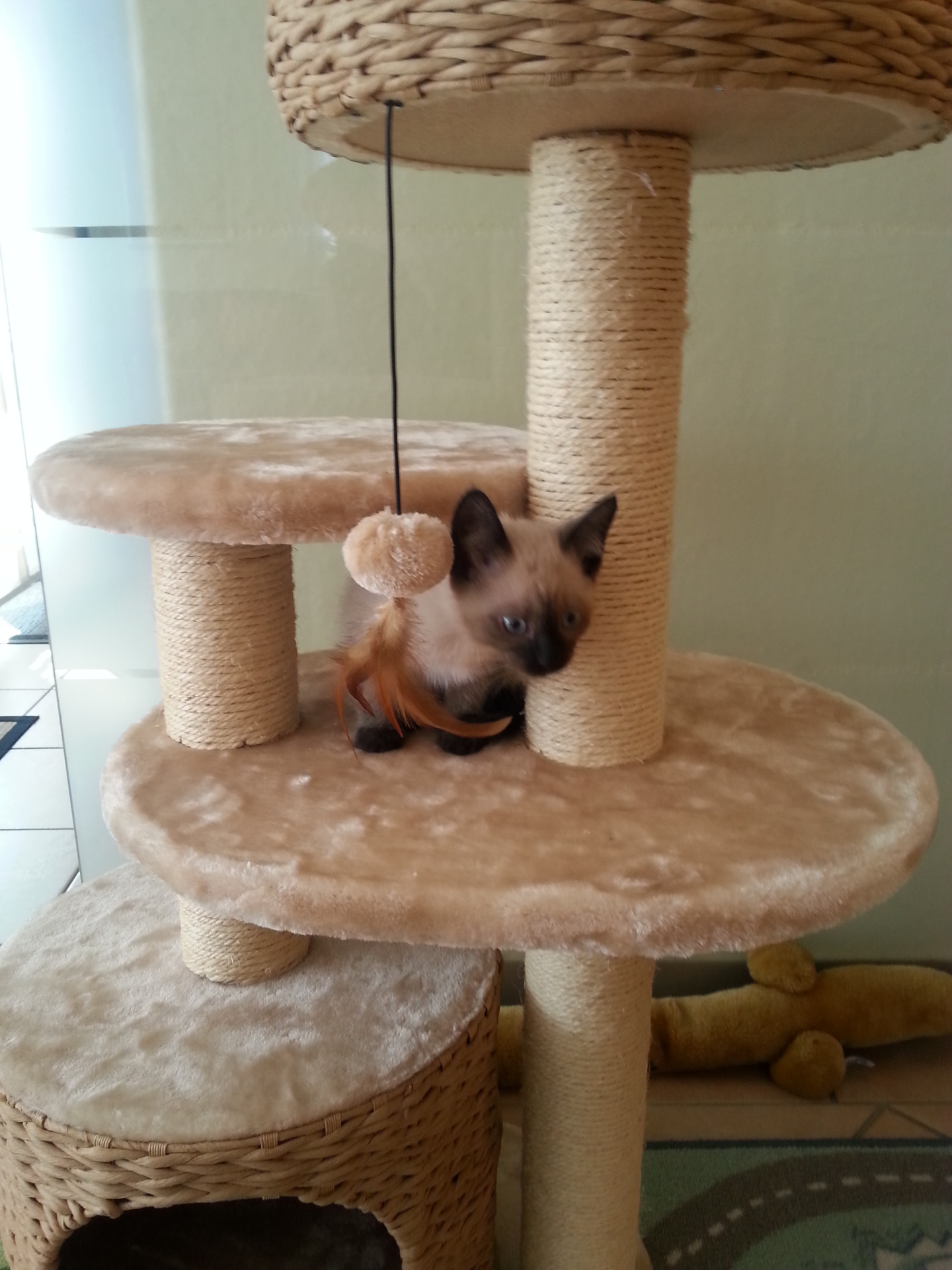 Siamesen brauchen Bewegung und viel Beschäftigung, um ihres ausgeprägten Jagdtrieb auszuleben und sich fit zu halten. Dafür bieten sich stabile Kratzbäume mit mehreren Ebenen an. Ein Freilaufgehege, wenn möglich, wäre sehr gut, da sie gerne die Natur beobachten.